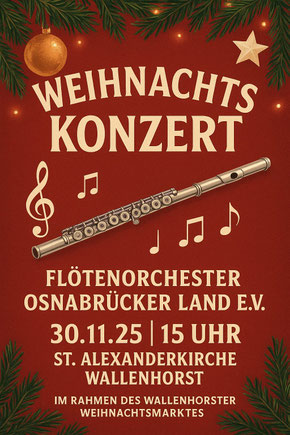 Wir laden herzlich zum Konzert auf dem Wallenhorster Weihnachtsmarkt in der St.Alexander-Kirche am Sonntag, 30. November 2025 um 15 Uhr ein. Ein stimmungsvolles Programm erwartet alle Besucherinnen und Besucher – ein schöner musikalischer Auftakt in die Adventszeit!
